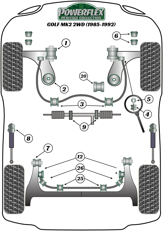 Tylna tuleja przedniego wahacza Powerflex Heritage Collection Volkswagen Golf & Golf MK2 (1985 - 1992)\Golf MK2 2WD (1985 - 1992) PFF85-203H