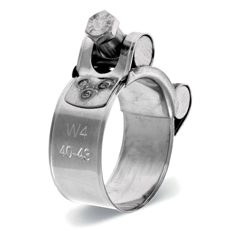 W4 – wszystkie elementy ze stali nierdzewnej (taśma, zamek i śruba); najwyższa odporność na korozję w trudnych warunkach.